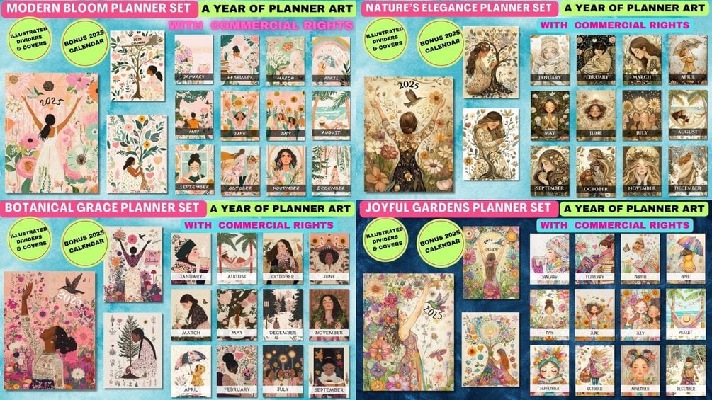 This collection offers a year’s worth of beautiful, themed illustrations designed to inspire and captivate. Each set is perfect for creating stunning, marketable planners that stand out.